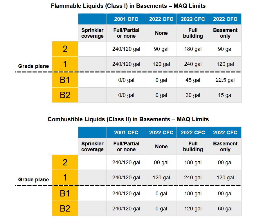It depends. Prior to the 2007 CFC, flammable liquids were prohibited from being stored in basements (any story that is not above grade plane). Combustible liquids were allowed to be stored in basements prior to 2007. Current CFC prohibits flammable and combustible liquids from being stored in basements unless the basement has sprinkler coverage per Chapter 9 of the CFC. If basements have sprinkler coverage, flammable liquid MAQs for basements are limited to open use quantities.