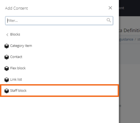 Unlike other kinds of blocks (link lists, flex blocks and contact blocks), staff blocks live in the Staff folder.